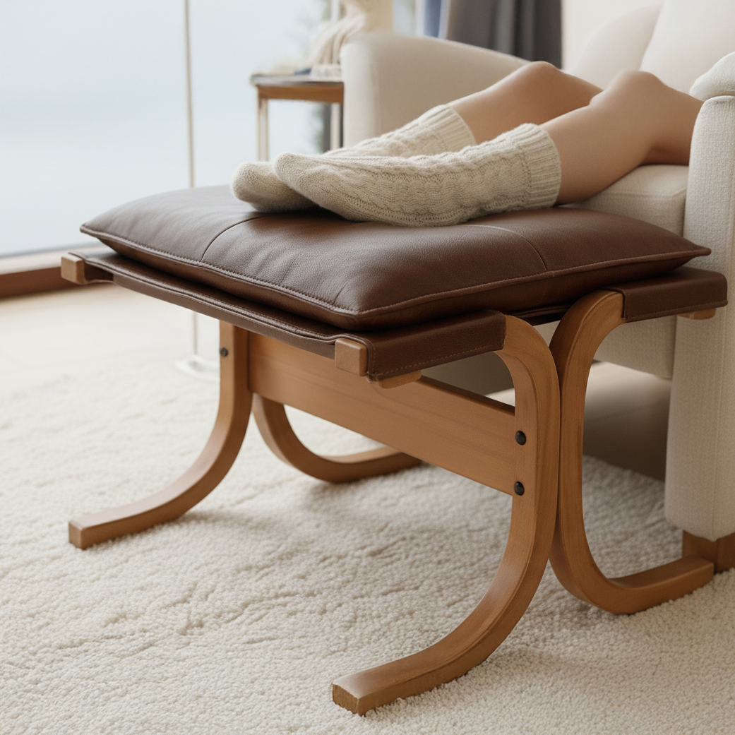 El Apoyapie Noruego es una pieza de inspiración escandinava que combina madera curvada y cuero natural para ofrecer comodidad y estilo en cualquier espacio. Su estructura en madera laminada presenta curvas elegantes que brindan estabilidad y carácter visual, mientras que el cojín acolchado en cuero ofrece un apoyo suave y confortable para los pies.