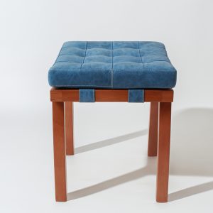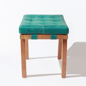 Sus patas curvas de madera sólida aportan liviandad visual y estabilidad, mientras que el cojín tapizado en cuero natural, con terminación capitoné, ofrece un toque clásico que realza su carácter refinado. Disponible en una amplia gama de colores, también puede personalizarse para adaptarse a distintos estilos decorativos.