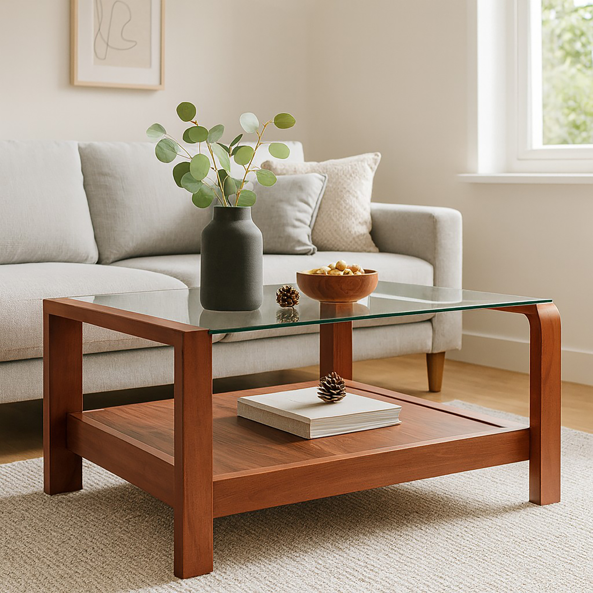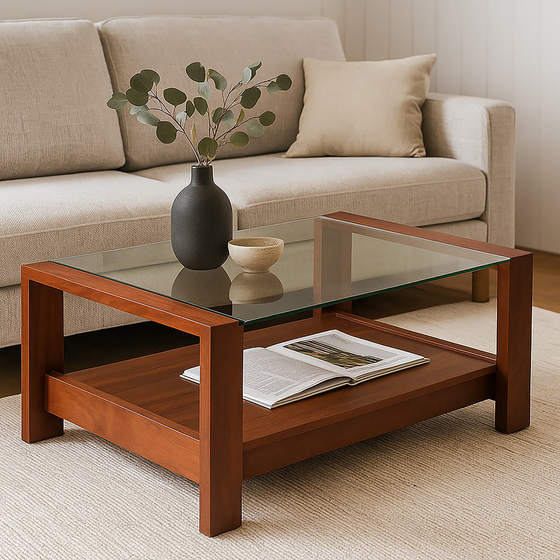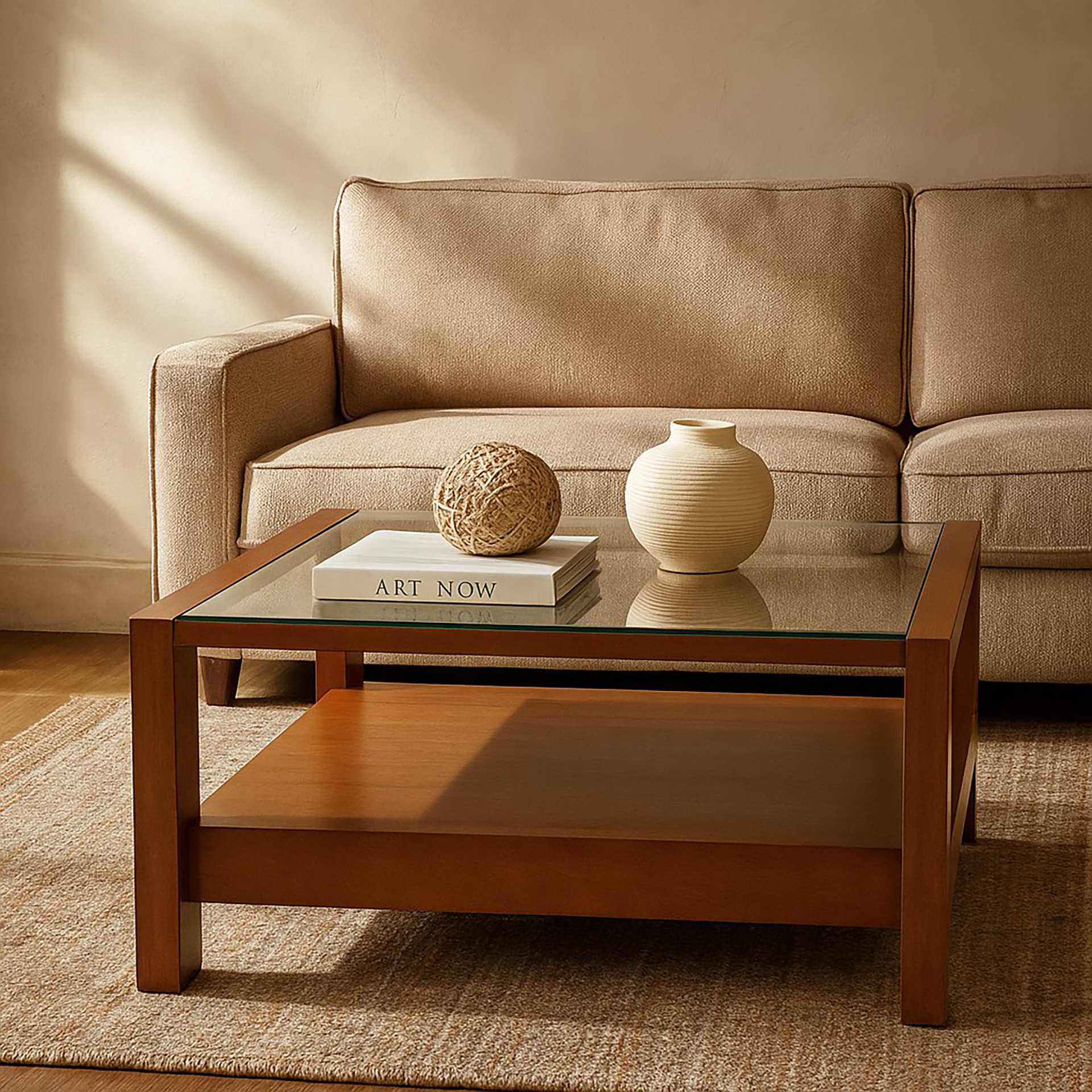 La Mesa de Centro Vague es una pieza de diseño contemporáneo que une materiales nobles con una estética limpia y funcional. Su estructura en madera maciza sostiene una cubierta de vidrio templado transparente, ideal para destacar el diseño sin sobrecargar el espacio. La repisa inferior, revestida en cuero natural, añade calidez y ofrece un espacio práctico para organizar libros, bandejas u objetos decorativos.