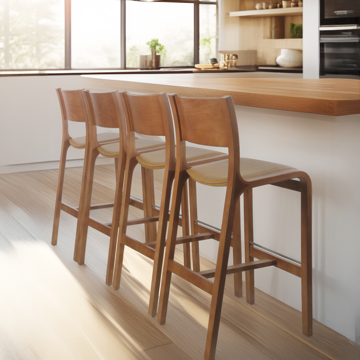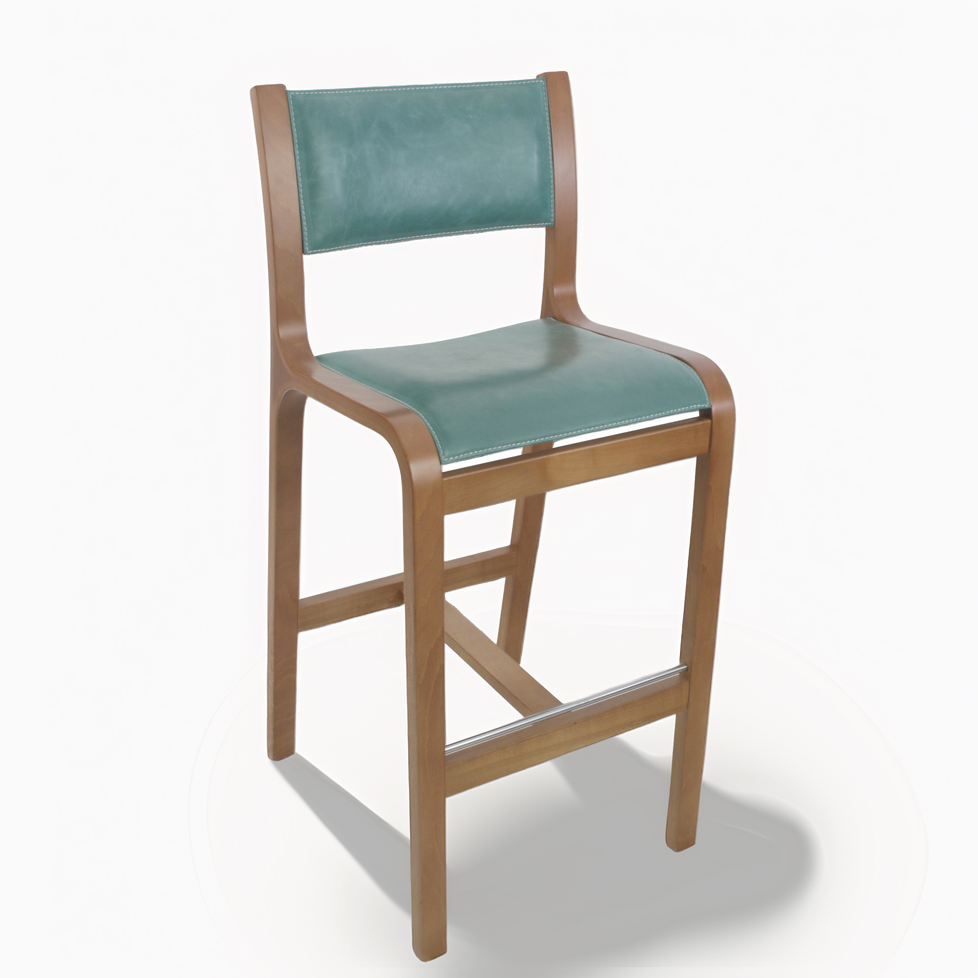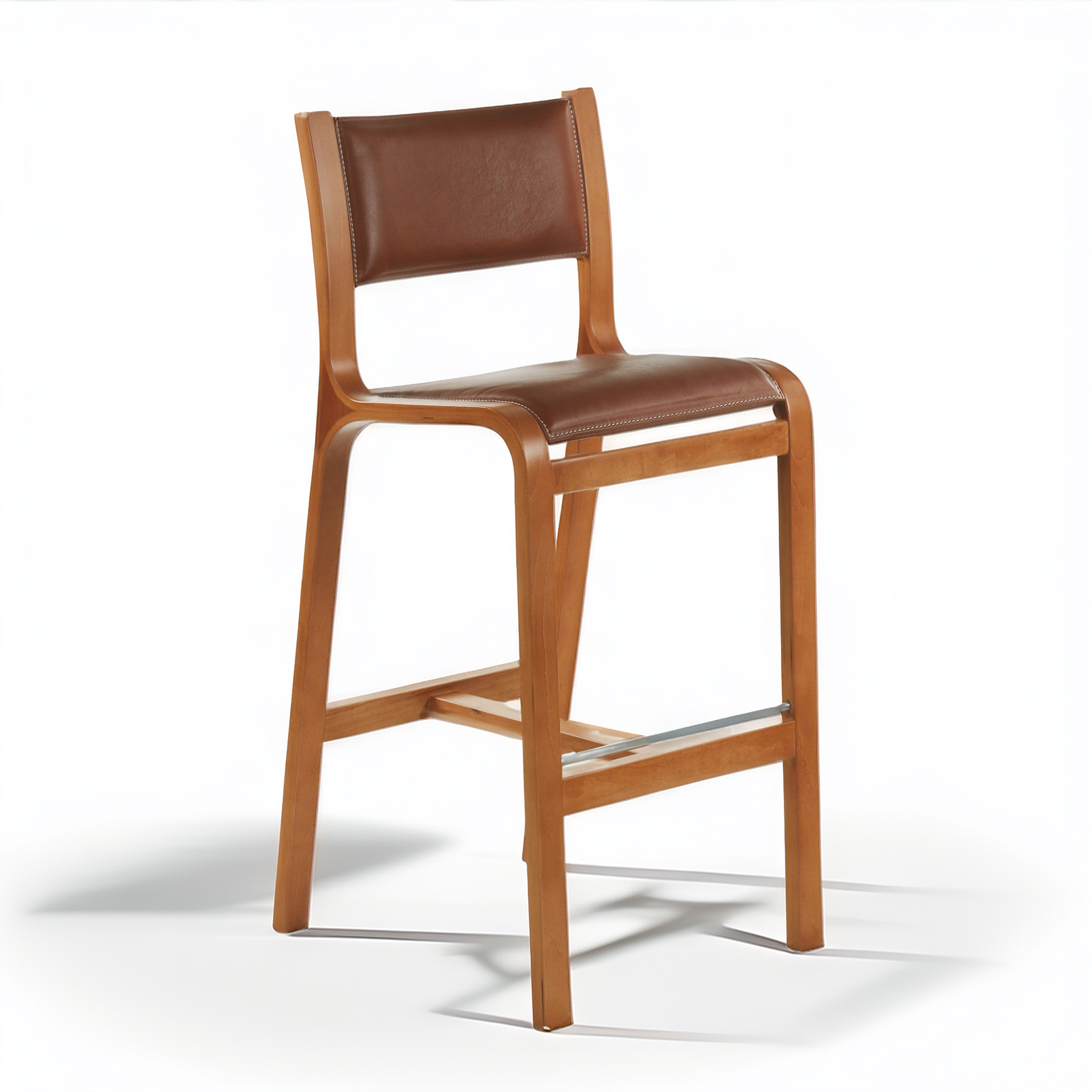 El asiento y respaldo tapizados en cuero natural brindan confort y un toque cálido, mientras que el reposapiés metálico asegura un apoyo cómodo incluso en usos prolongados. Su estructura firme lo convierte en una opción confiable para cocinas con isla, barras de hogar o espacios comerciales exigentes.