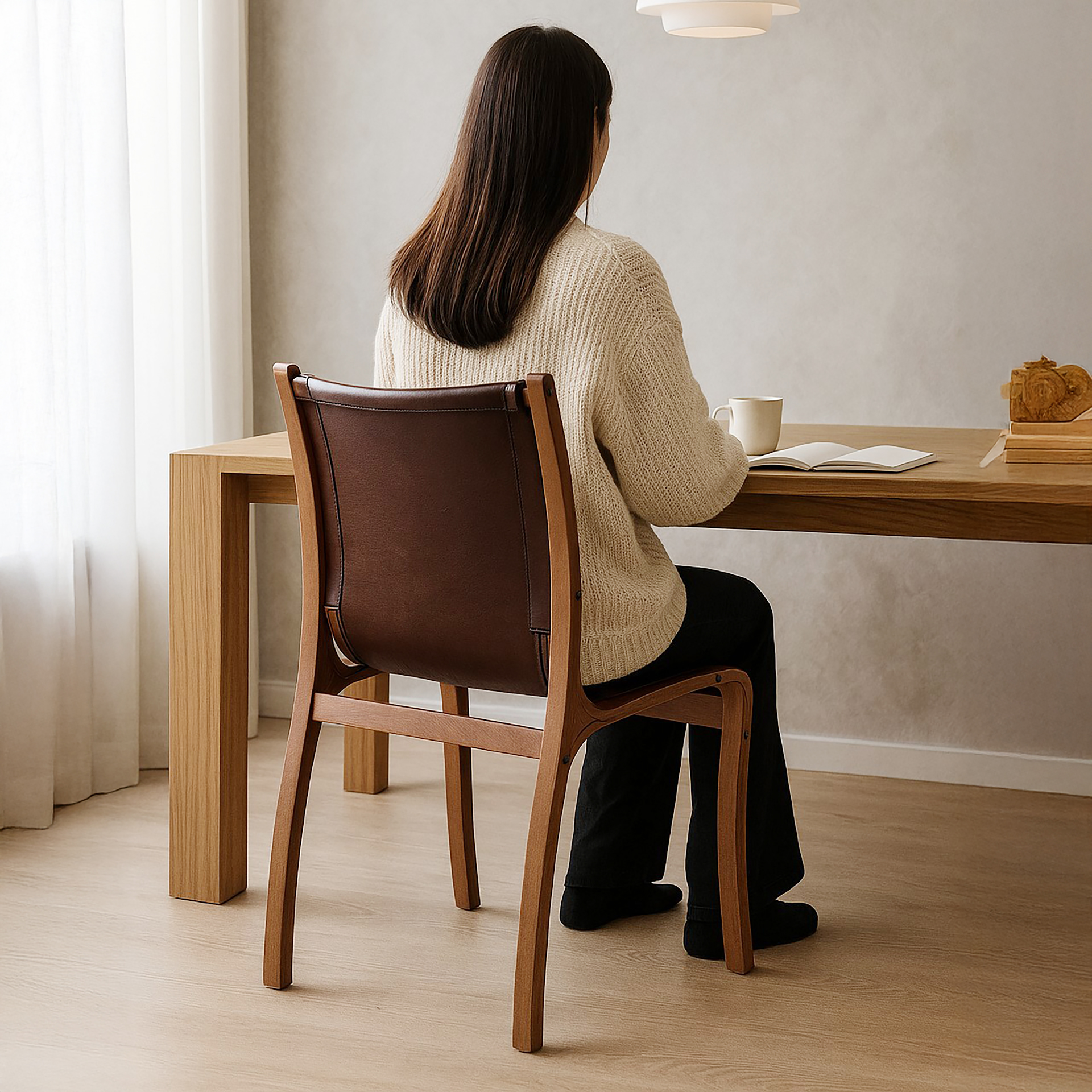 La Silla Bilbao con respaldo alto está pensada para quienes requieren mayor soporte en la zona dorsal sin renunciar a la estética y la sofisticación. Su estructura en madera curvada laminada se adapta de forma orgánica al cuerpo, mientras que el tapizado en cuero natural aporta durabilidad y elegancia atemporal.