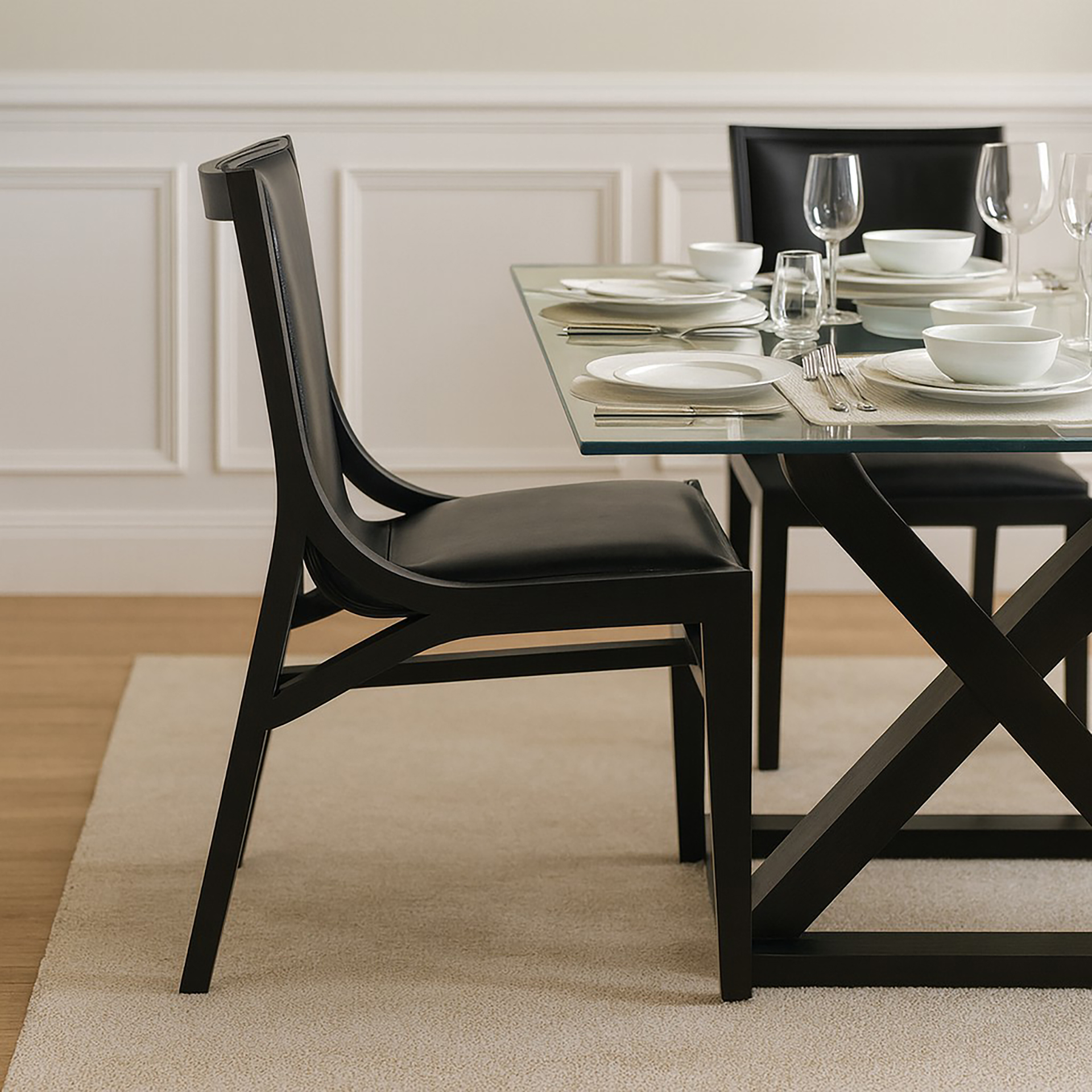 La Silla Ferrara fusiona elegancia y modernidad con una estructura de madera maciza de líneas limpias y proporciones equilibradas. Su diseño sobrio resalta por un respaldo curvado que se proyecta desde las esquinas, aportando una silueta distintiva y sofisticada.