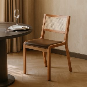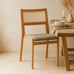 La Silla Pluma con respaldo enjuncado destaca por su diseño minimalista y ergonómico, inspirado en las líneas limpias del estilo nórdico. Su estructura liviana de madera curvada y su respaldo con trama de enea natural (enjuncado) combinan ligereza visual, ventilación y calidez artesanal.