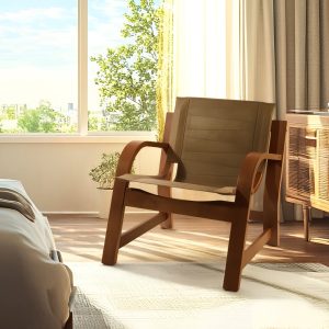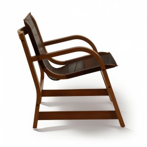 El Sillón Domani se distingue por su diseño depurado, donde la estructura de madera curvada se une a una superficie de asiento y respaldo en cuero natural, formando una silueta flotante que invita al descanso. Su estilo combina ligereza visual, solidez estructural y una elegancia que no pasa de moda.