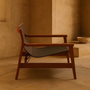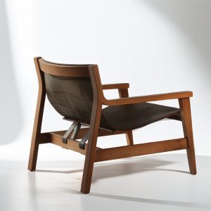 Su estructura en madera curvada aporta solidez y presencia, mientras que el asiento y respaldo en cuero natural conforman un diseño colgante o suspendido, que se adapta al cuerpo ofreciendo confort y flexibilidad. Esta característica le otorga un carácter ligero y elegante, sin perder robustez ni resistencia.