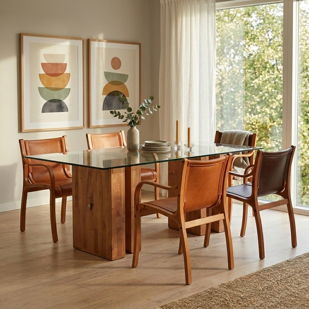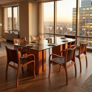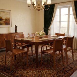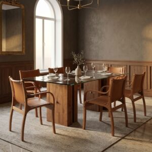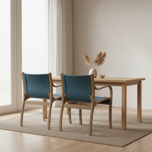 El asiento y respaldo tapizados en cuero natural realzan su carácter artesanal, mientras que su diseño envolvente y ligeramente más ancho lo convierte en una excelente opción para mesas principales, escritorios ejecutivos o salas de espera de alto nivel.