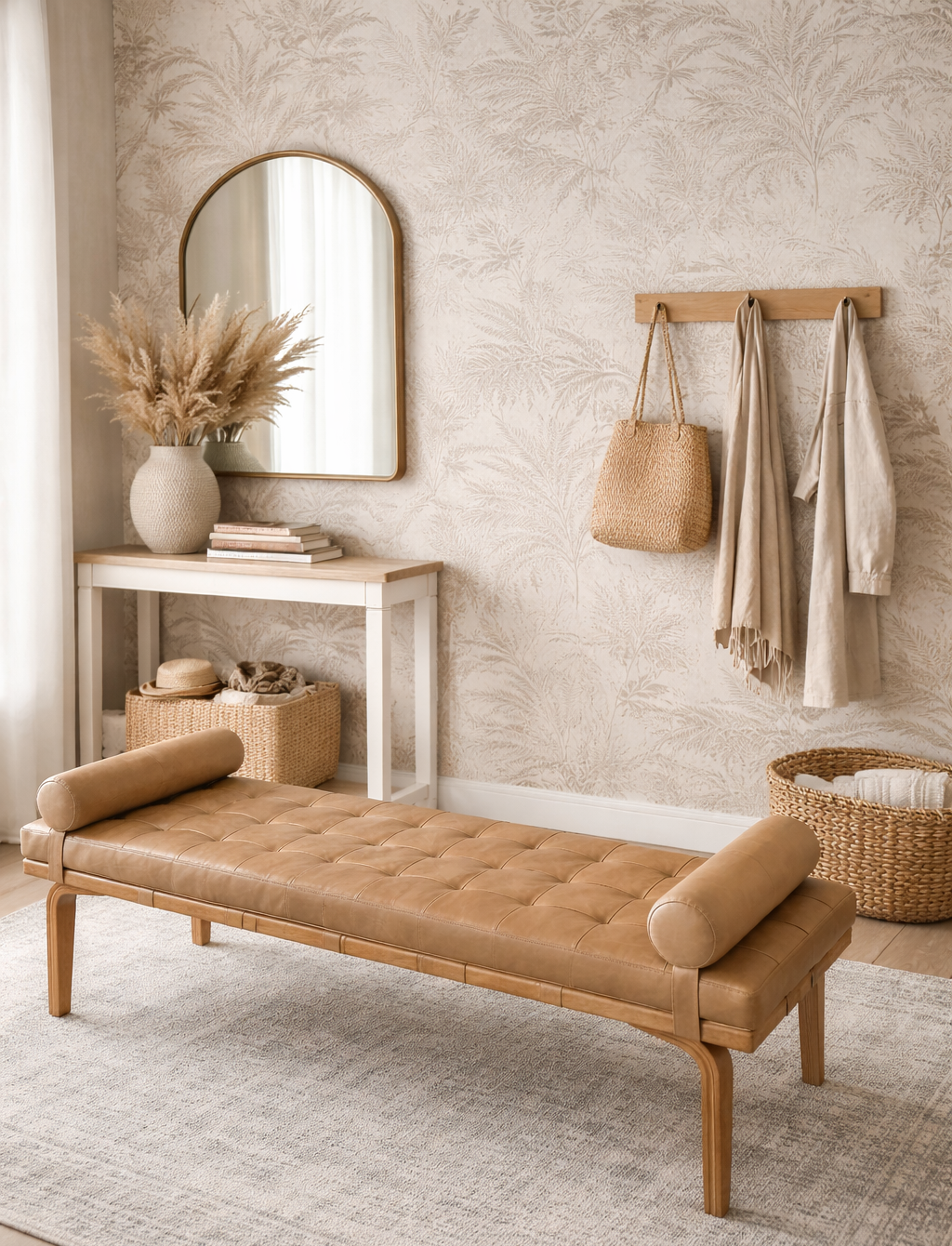 BANQUETA DE CUERO BEIGE Y MADERA MIEL