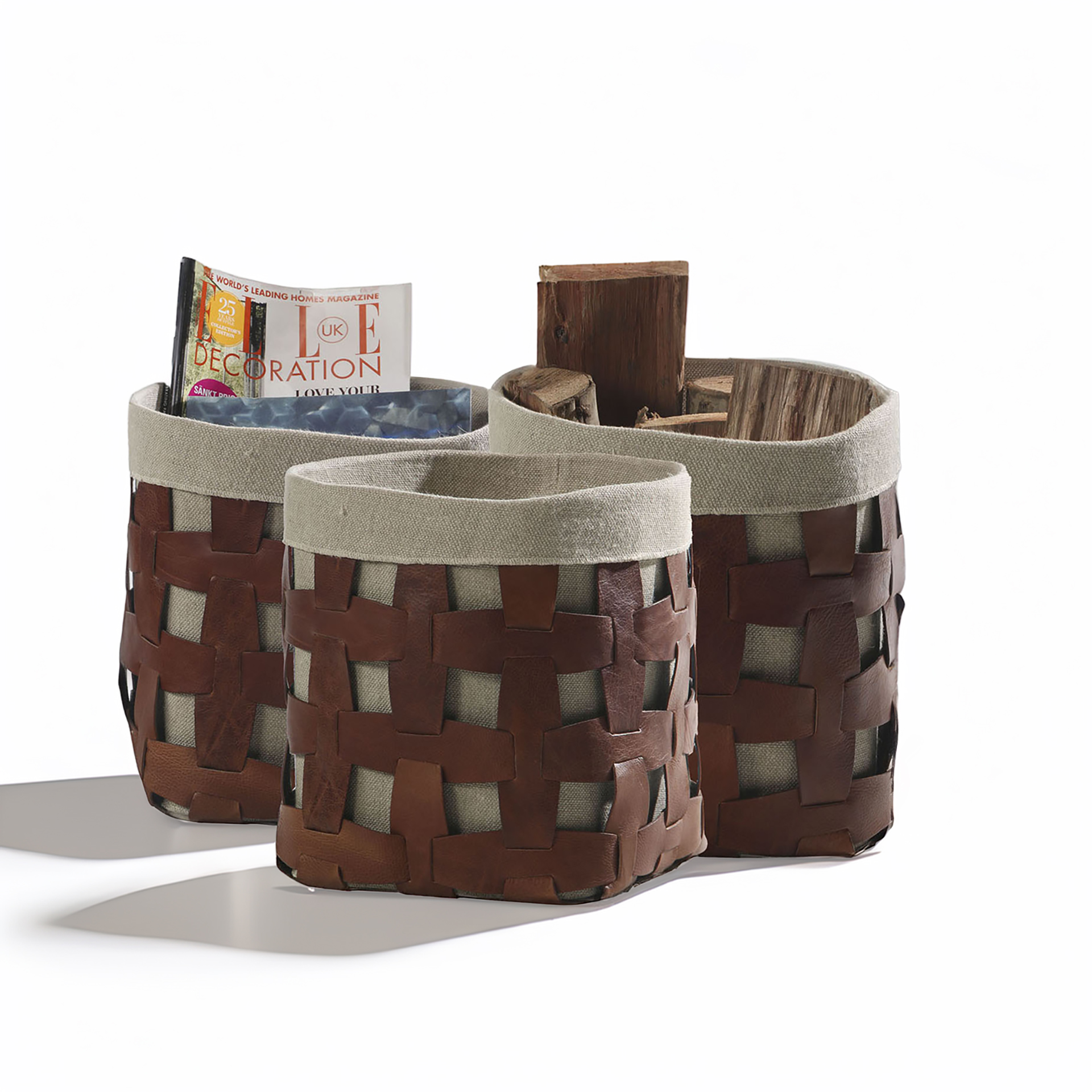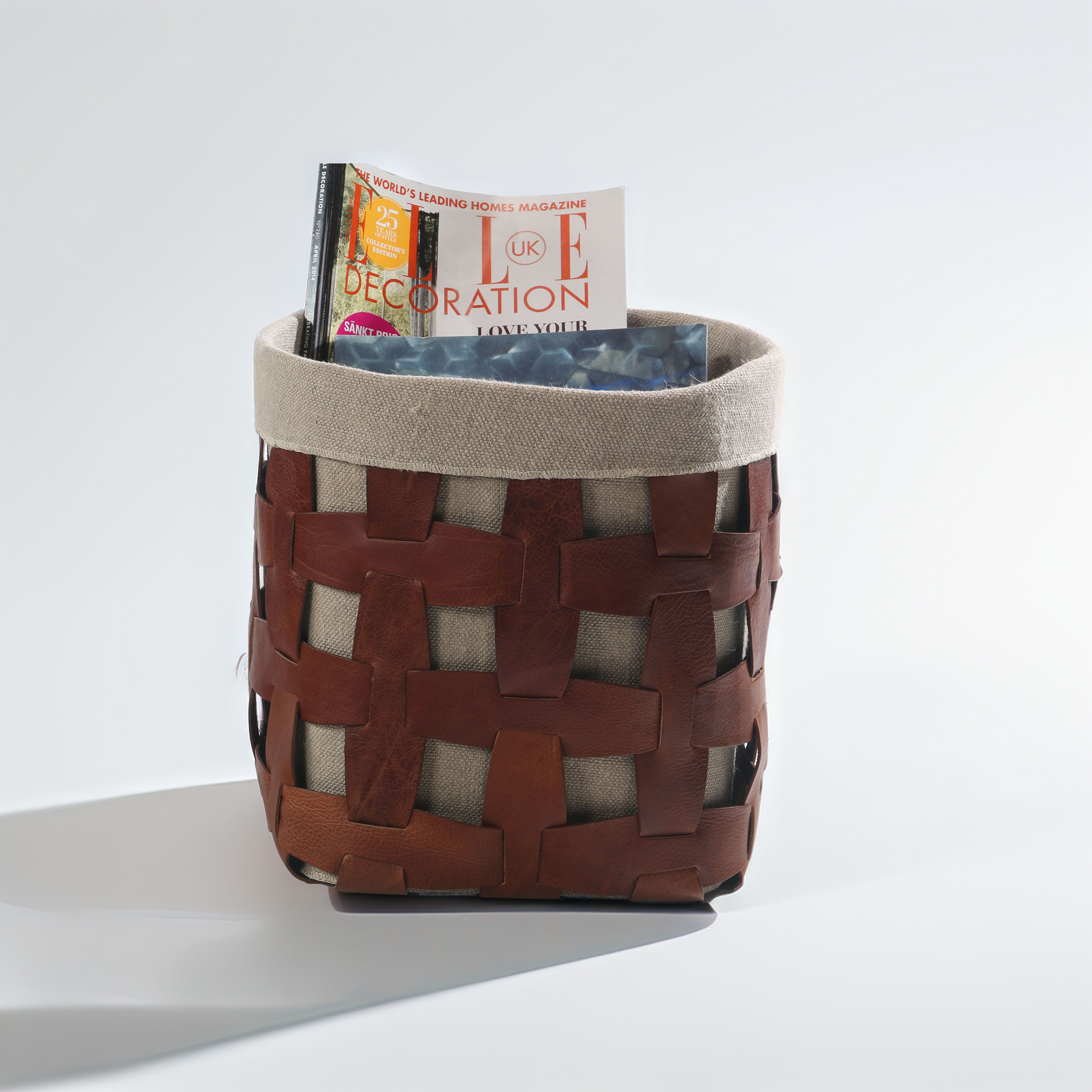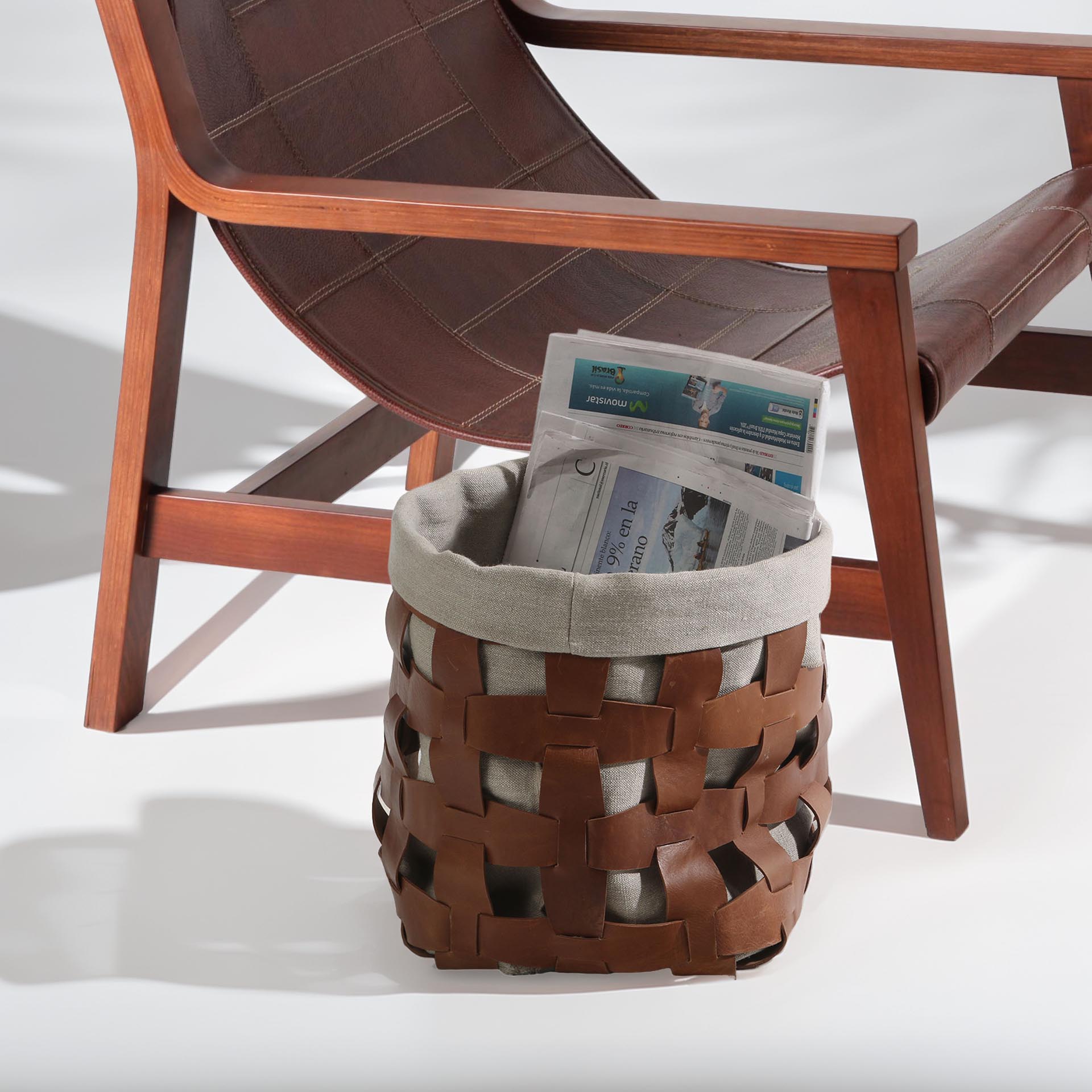 Este canasto multiuso es parte de nuestra colección de objetos hechos con cuero recuperado, reutilizando pequeños pedazos que sobran de la fabricación de nuestros muebles. Cada pieza es única, con un entramado artesanal que combina cuero natural y lino grueso, logrando un equilibrio perfecto entre estética y sostenibilidad.