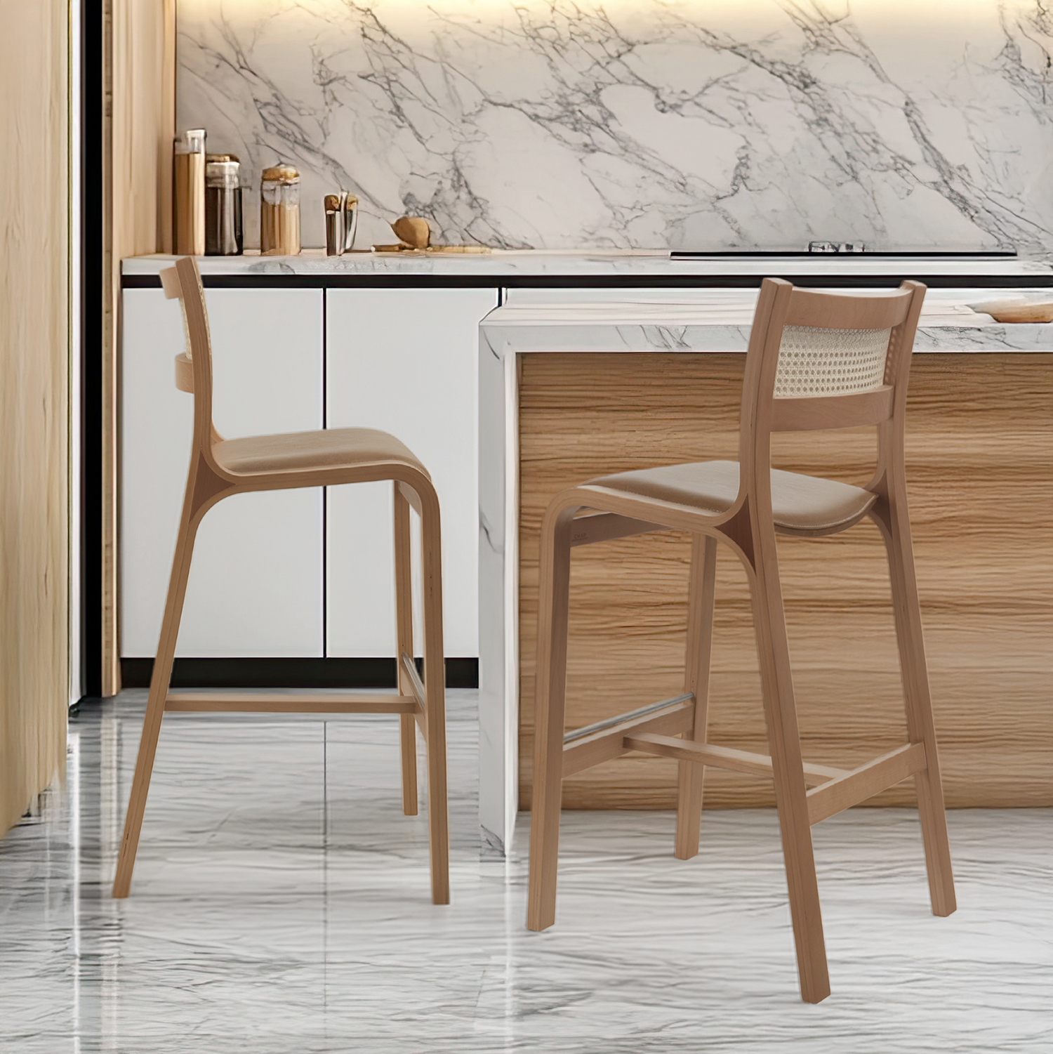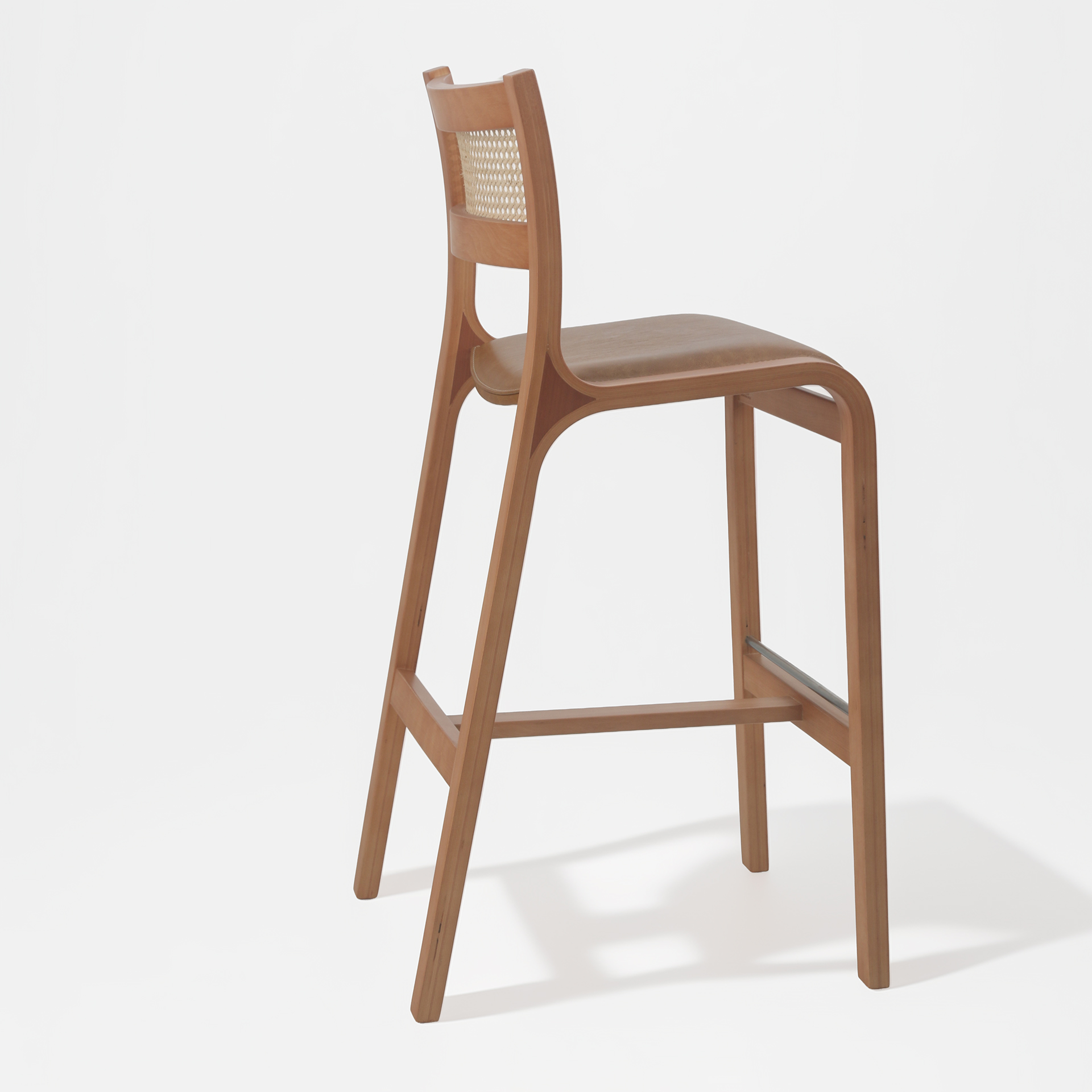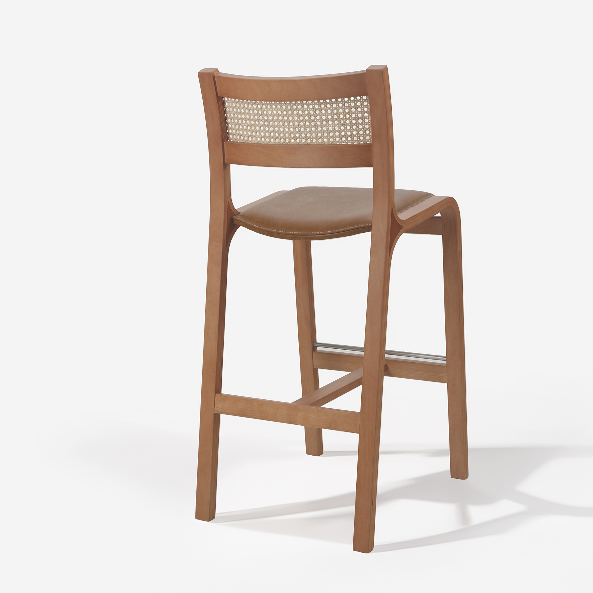 Trento – Piso de Bar en Madera Curvada, Cuero Natural y Respaldo de Junco