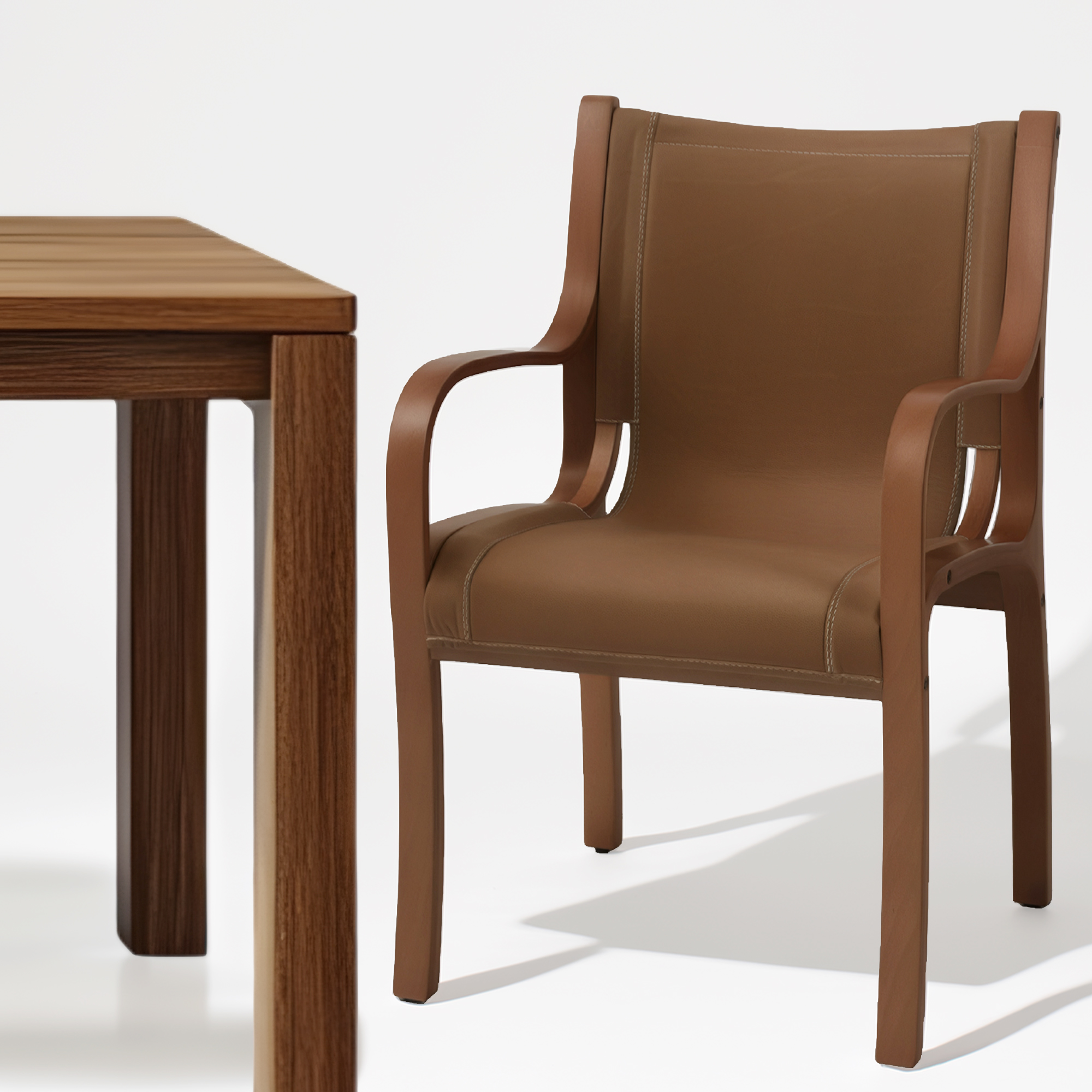 El asiento y respaldo, tapizados en cuero natural cuidadosamente trabajado, refuerzan la presencia noble de esta pieza, que se adapta con facilidad tanto a comedores y mesas principales como a oficinas ejecutivas o espacios de reunión de alto nivel.
