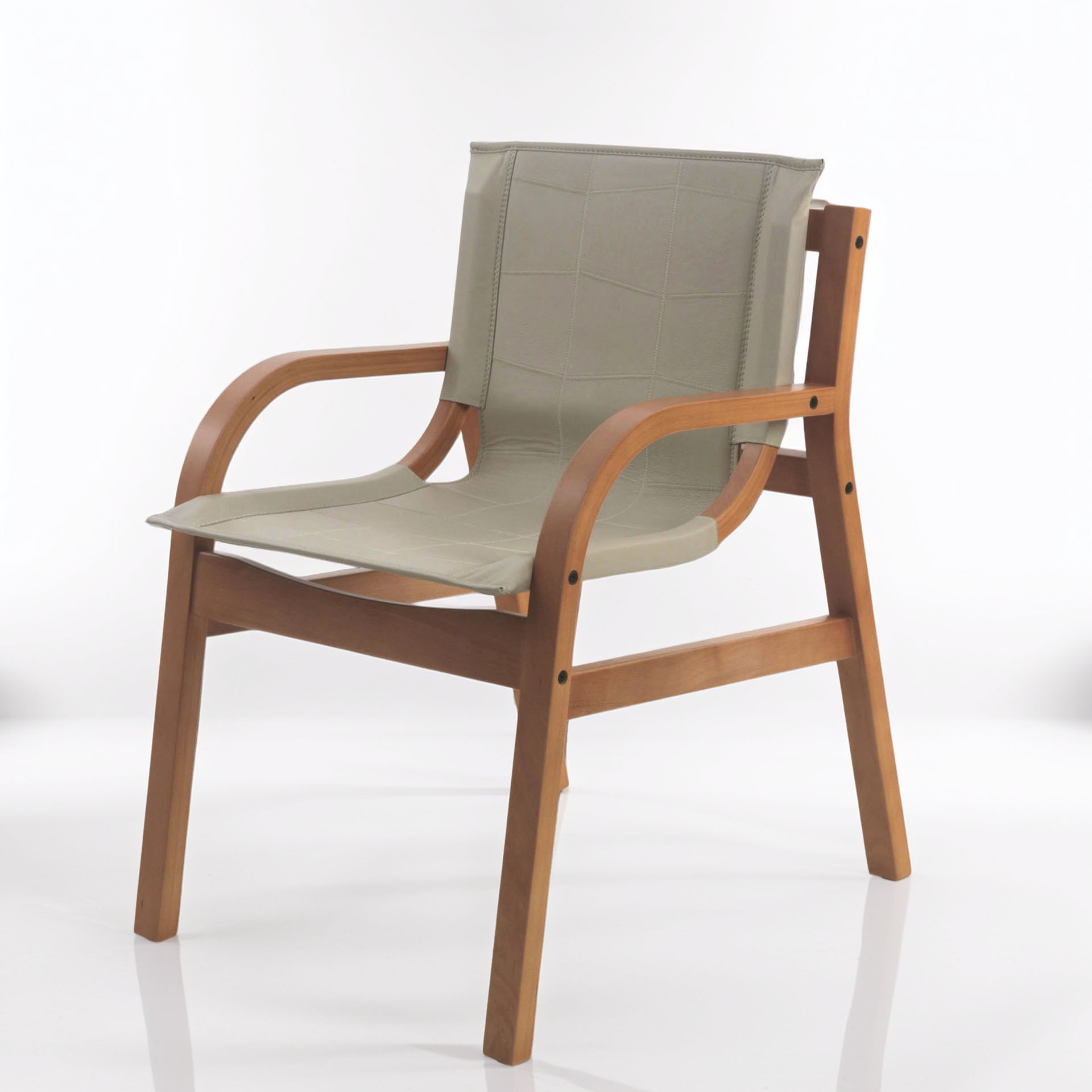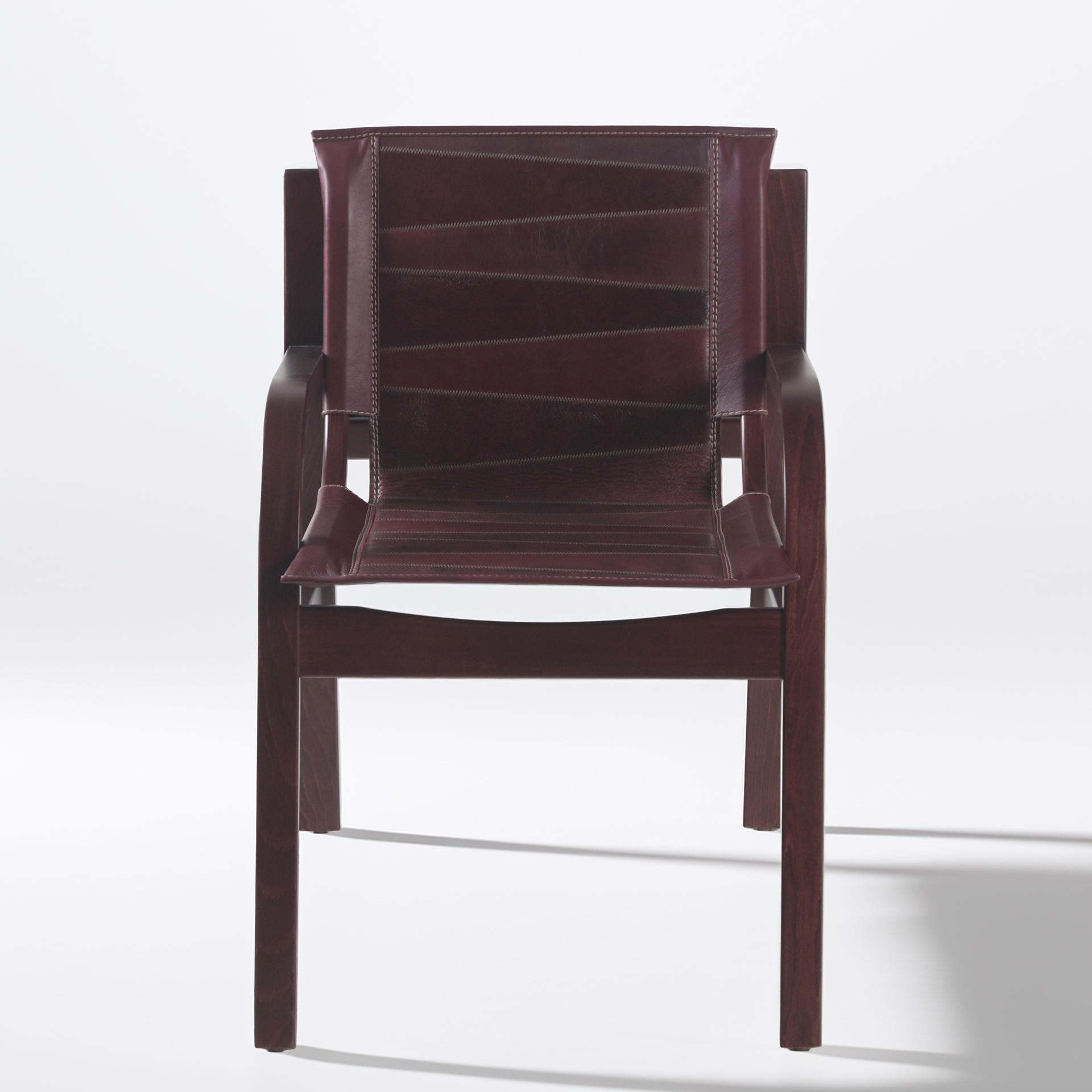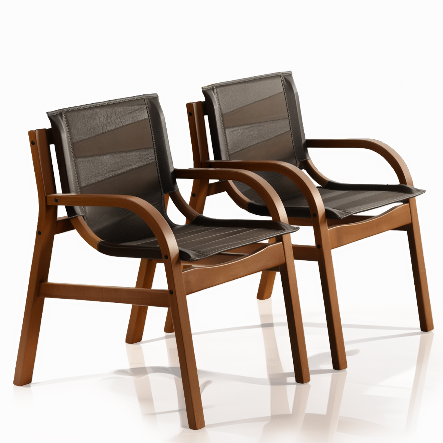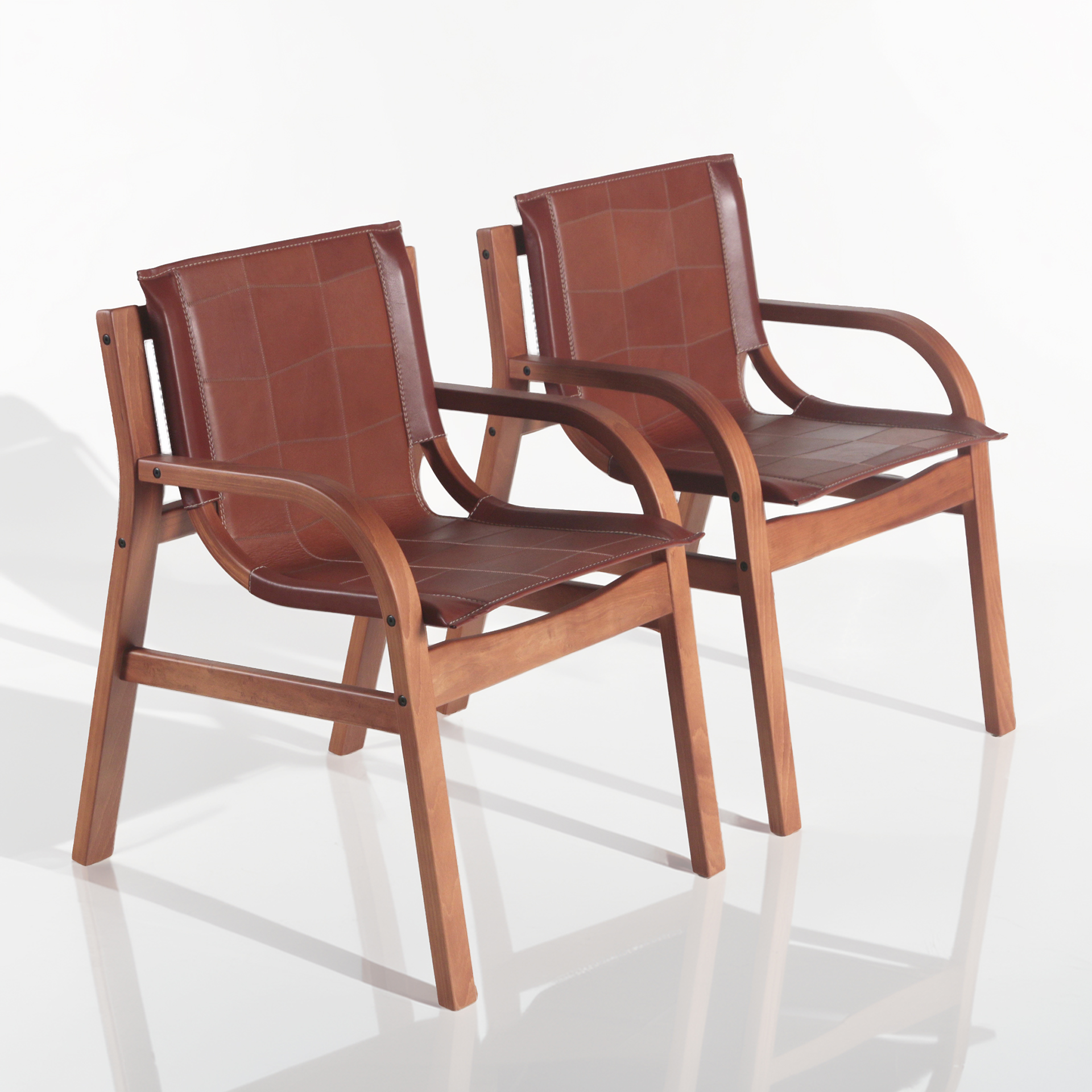 Su asiento y respaldo están construidos con cuero natural montado en bandas que aportan flexibilidad, soporte y una apariencia distintiva. La forma ligeramente inclinada de su respaldo y la amplitud de su base lo convierten en un sitial cómodo para uso prolongado, ideal para comedores, salas de estar, escritorios o espacios de recepción.