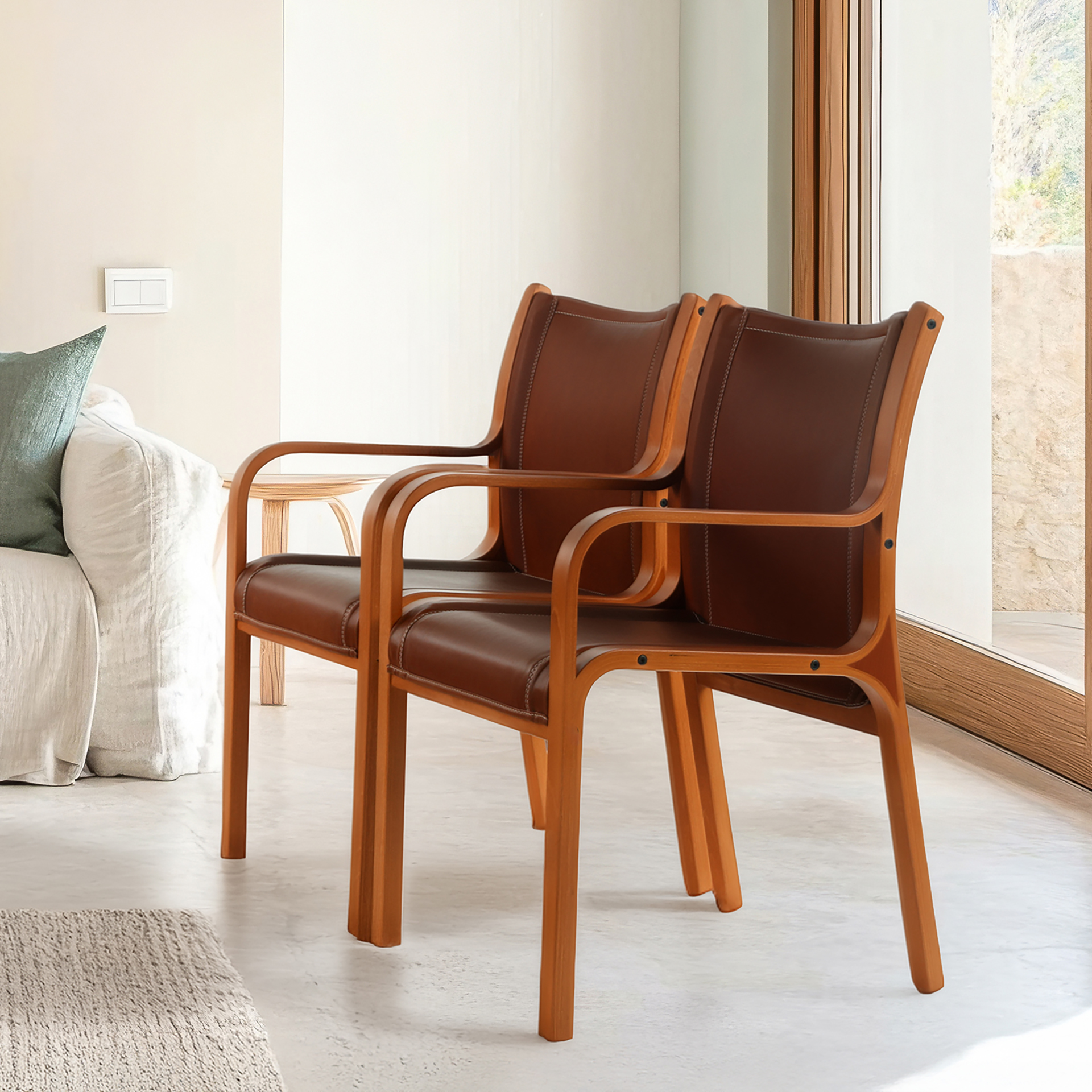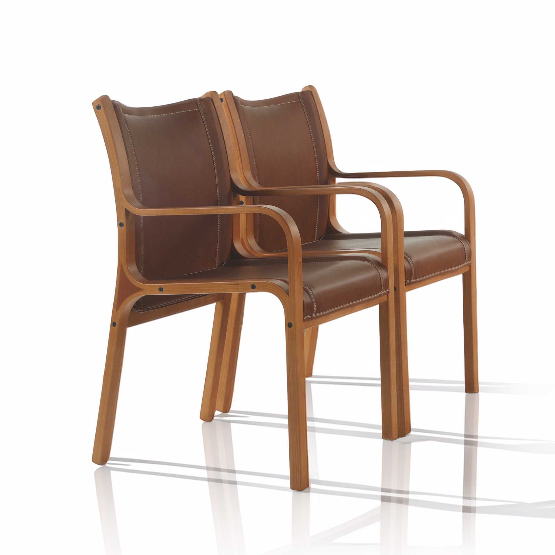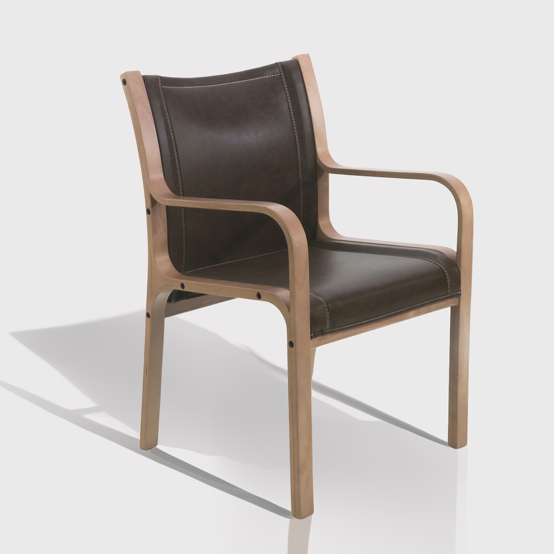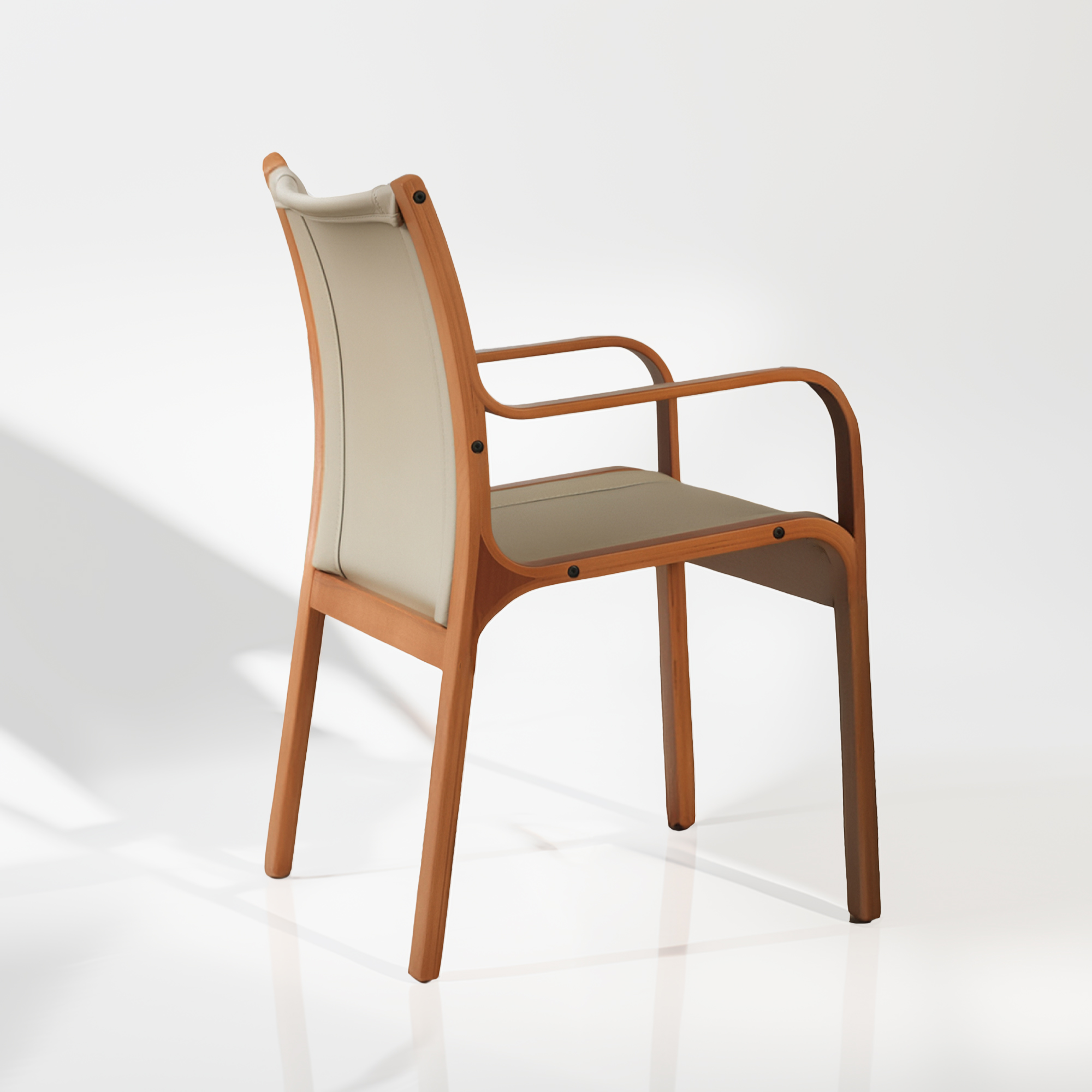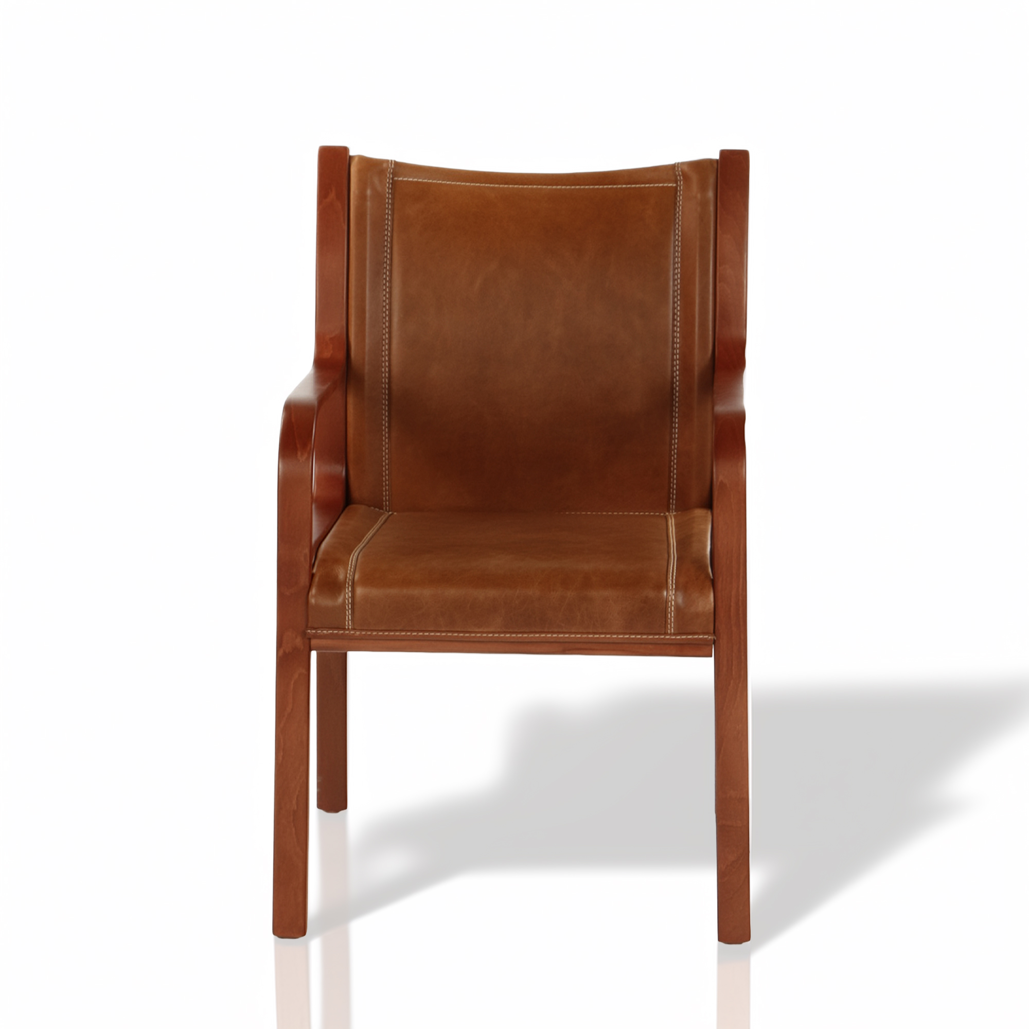 El asiento y respaldo separados, tapizados en cuero natural, permiten una postura más confortable y un apoyo ergonómico para largas reuniones en torno a la mesa. Su calidad constructiva lo hace ideal para comedores familiares, espacios institucionales o proyectos de interiorismo clásicos que buscan incorporar mobiliario que perdure por generaciones.