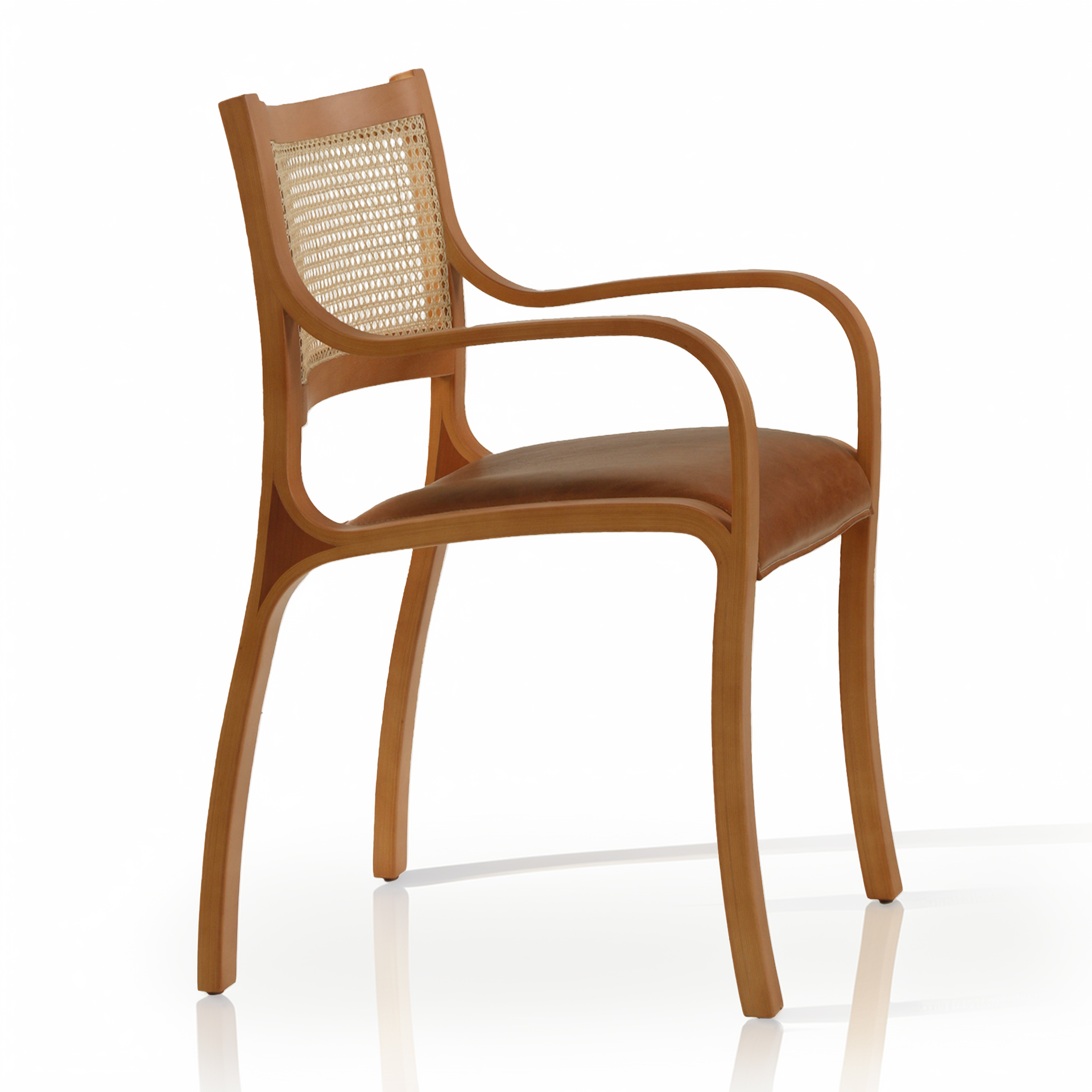 El Sitial Trento con respaldo enjuncado es una pieza que reúne diseño armonioso, confort y nobleza de materiales. Su respaldo alto con entramado de enea tejido a mano aporta una sensación de ligereza visual, mientras que su estructura de madera curvada con brazos integrados entrega una silueta envolvente y refinada.